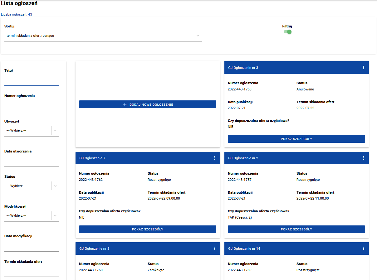 Masz możliwość przefiltrować listę ogłoszeń podając szukaną frazę zawartą w tytule ogłoszenia lub w jego numerze. Możesz też wybrać z listy autora lub osobę, która jako ostatnia modyfikowała ogłoszenie, datę utworzenia lub modyfikacji, status oraz termin składania ofert do ogłoszenia.