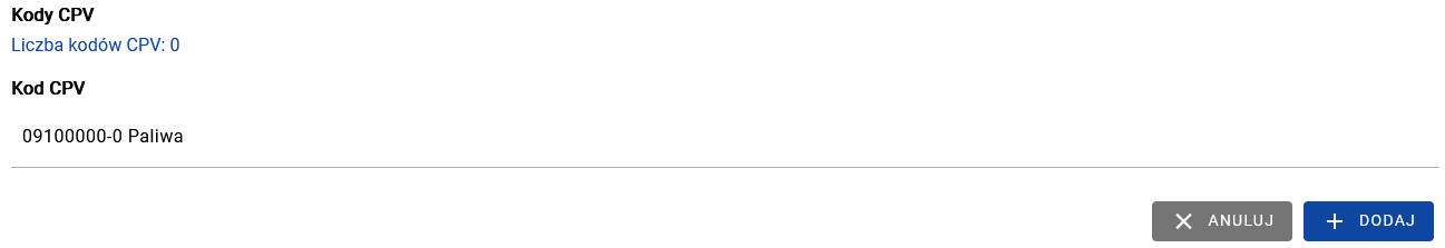 Dodawanie kodów CPV oraz miejsc realizacji zamówienia każdorazowo musisz potwierdzić przyciskiem „Dodaj”.